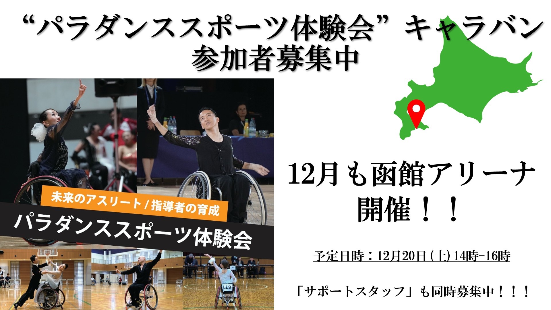 2025年12月20日(土)に北海道函館市「函館アリーナ」にて開催の『パラダンススポーツ体験会』を開催します。 ダンス未経験者の方はもちろん、ダンス好きの方、社交ダンス経験者の方まで、 パラダンススポーツに興味のある車い …
