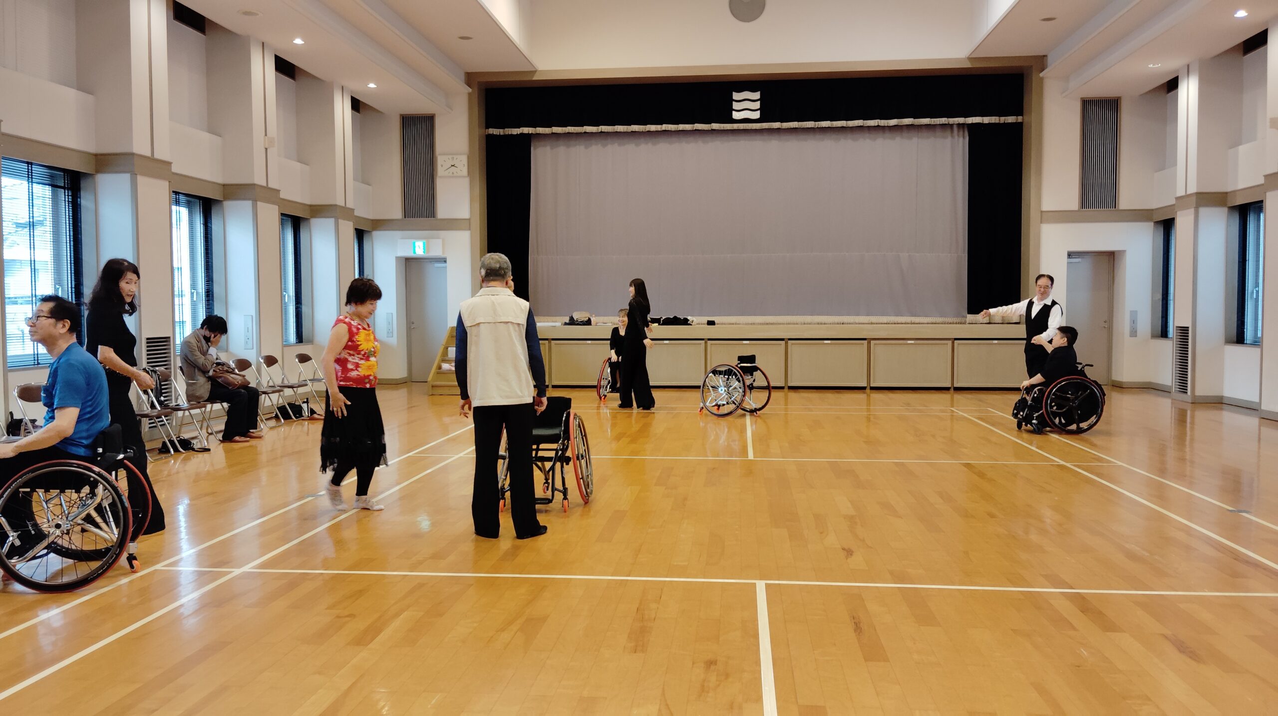 全くの初めての方から、社交ダンス経験のある方がパラダンススポーツへ興味をもって参加くださり、車いすの操作を体験したり、スタンディングとしてどのように組むのか、車いすが動くのか等をワルツやルンバの曲などに合わせての体験会となりました。