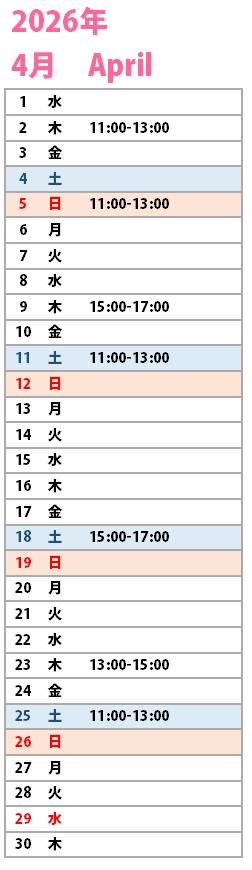 4/2(木) 15時ー17時 4/5(日) 11時ー13時 4/9(木) 15時ー17時 4/11(土) 11時ー13時 4/18(土) 15時―17時 4/23(木) 13時ー15時 4/25(土) 11時ー13時